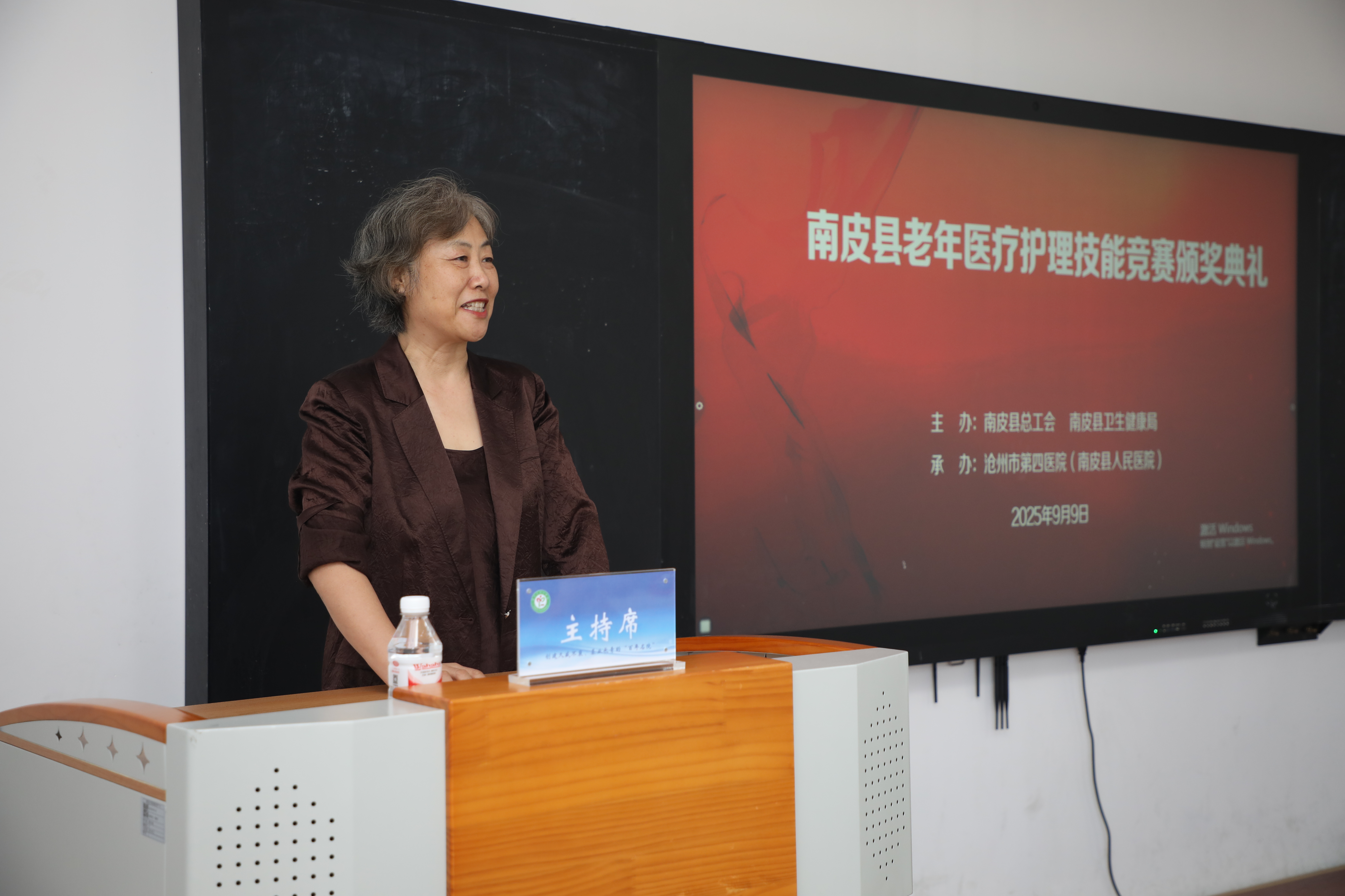 为全面提升老年医疗护理服务水平,加强专业人才队伍建设,9月9日,由南皮县总工会、南皮县卫生健康局主办,沧州市第四医院(南皮县人民医院)承办的老年医疗护理技能竞赛暨颁奖典礼在沧州市第四医院(南皮县人民医院)圆满落幕。来自全县医疗机构的90余名医疗、护理人员,经过理论考核,有60余名选手晋级决赛。县总工会常务副主席李红军、卫生健康局副局长叶存博出席活动并为获奖选手颁奖,沧州市第四医院副院长张钟匀主持颁奖典礼。