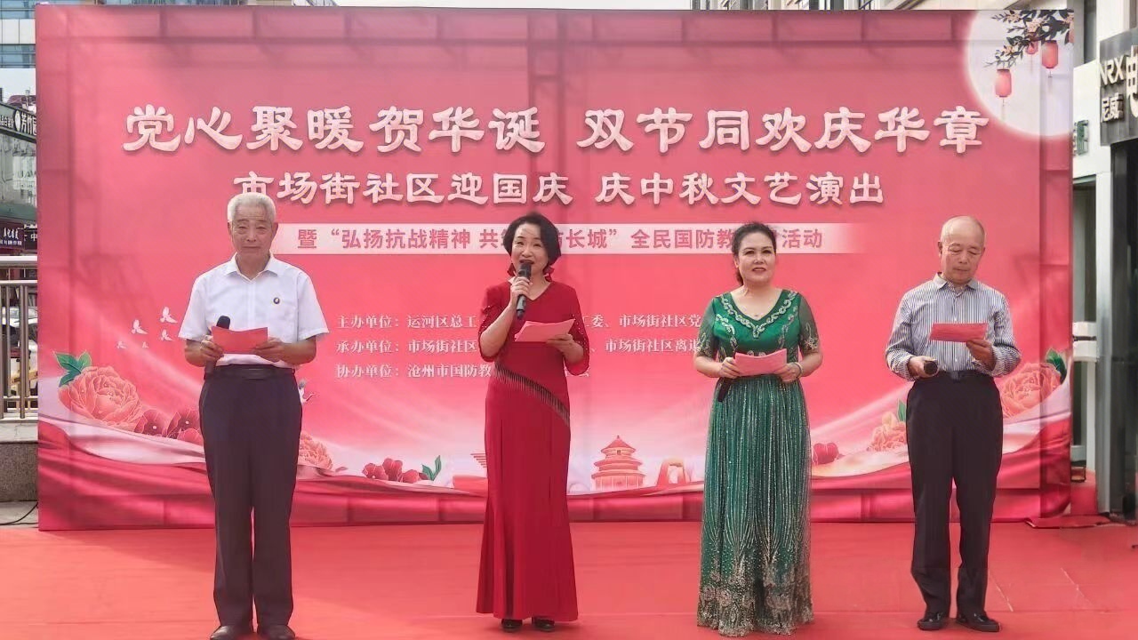 金秋送爽,丹桂飘香,在中华人民共和国成立75周年与中秋佳节双节来临之际,为丰富职工精神文化生活,凝聚职工奋进力量。9月28日,由沧州市运河区总工会联合市场街道党工委、市场街社区主办的“迎国庆 庆中秋”文艺演出在商业街广场精彩上演,辖区职工及其家属欢聚一堂,共庆祖国华诞,共话团圆深情。